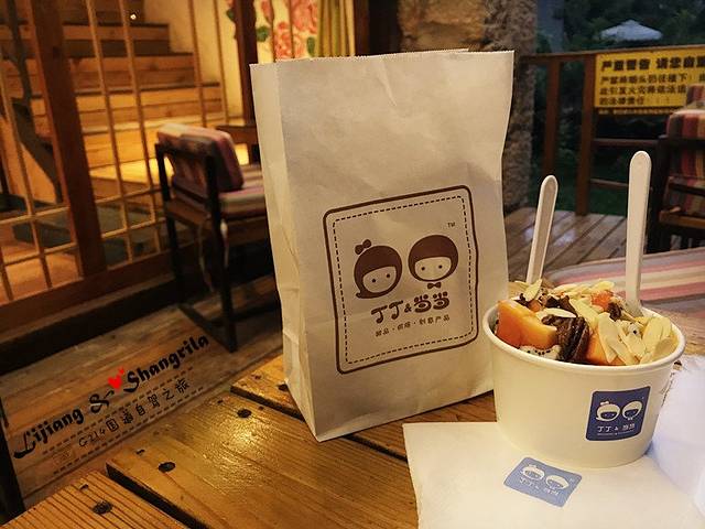 吃得太饱了,走起来都费劲。天色渐暗,夜幕下的束河古城即将呈现。。继续无所事事地走着走着,又经过青龙桥。遇见了丁丁当当,因为明天就要回程了,这次不想再错过了。。在美团买了套餐,19元包含一个小份坚果水果酸奶和一个咖啡面包。。啊哟面包忘了拿出来拍拍照。。good,真的好吃好吃。。