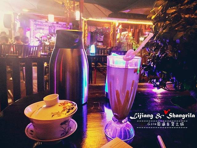 露天顶楼,天暗下风有点大。客人越来越多,驻场歌手开始了他们的表演。。我们点了一杯热姜茶和一杯桂花普洱,96元。。恩,感觉点的这两杯,很有保温瓶泡枸杞的韵味啊,哈哈!!茶具(不知道叫啥名)跟我们的潮汕功夫茶具是一模一样的,只是功能不同,我们仅仅是用着泡茶,这店里是泡茶然后直接端着喝。。