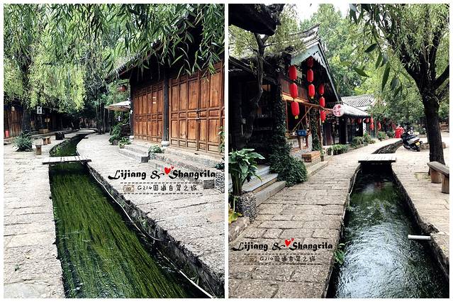 转了一圈,来到一个跟刚才风格比较不一样的地方。一条小河安静地淌着,沿河是翠绿的柳树。河水超级清,河里的水草也很有意思。朝着水流的方向生长,摇摇曳曳,好像洗过飘柔的头发。或许大研古城的水草也长这样,只是我们没见过它白天的模样。
