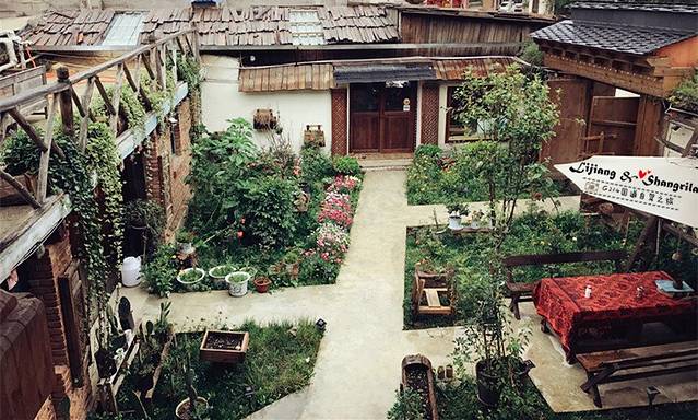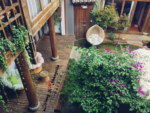这是睡醒客栈的样子。从楼上俯视院子,木地板、小秋千、遮阳棚。。觉得装修得挺用心。