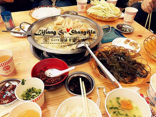 中午11点,我们坐上景区大巴,到达餐厅。用餐的店叫做“雪花餐厅”,八个人围一方桌。桌椅很有意思,像幼儿园小朋友坐的那个高度,不清楚是不是地方特色。吃的排骨火锅,有我喜欢的海带和白菜,感觉很满足。。饭菜不够可以加,管饱。还有茶水和白开水外带。还有零食和拌酱试吃推荐,确实蛮好吃,但是我们没买嘿嘿。。。虽然大家都不认识,但却对彼此照顾有加,添饭盛菜打汤,由衷高兴新时代的年轻人都如此有素养。然后,聊着聊着才知道同行的独自旅游的小哥跟我们是同城的,都说潮汕话的。。哈哈,早上议论他的话,可能就被听到了。。