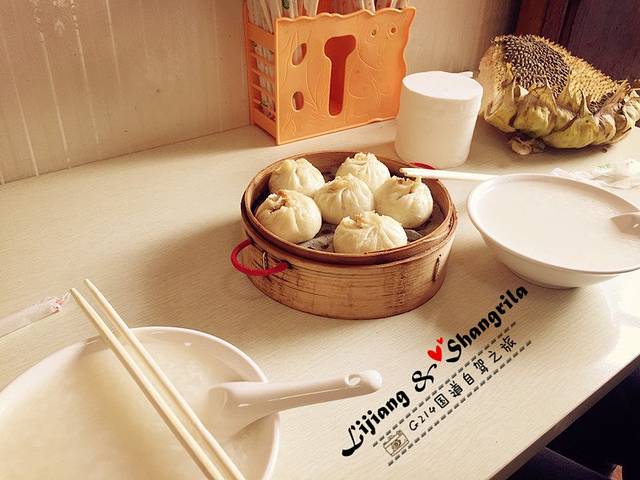 拖着行李车,很快来到了派出所路口。。早晨的宁静古城还真不愁没有早饭吃,早餐店很多。。我们很随机地在店主的热情招呼下,进了一间店。点了两份热粥和一份小笼包。。粥没有我期待中的那么热。。总共14元。。发现好多商店的主人都在边看着店边掰向日葵,也有看到卖的,从机场过来的路上,也看到好多种植的。。。