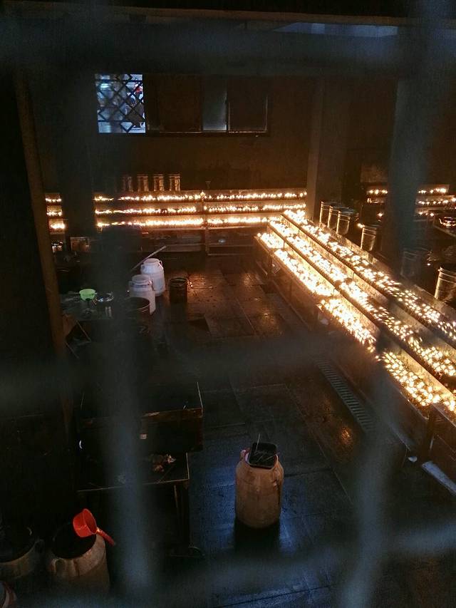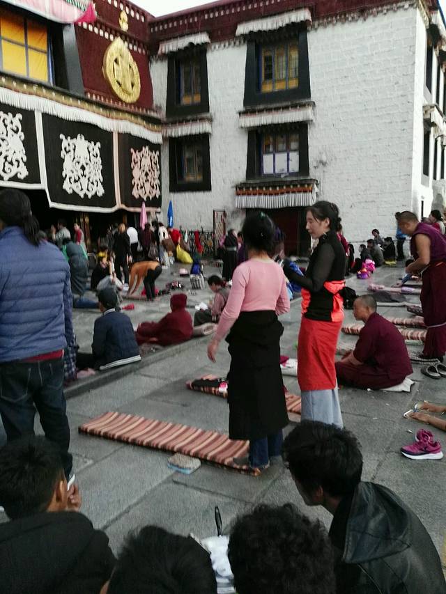 大昭寺门口有一处低于地平的房屋,里面点亮了很多酥油灯,后来问导游,导游说,大昭寺因为祈福酥油灯失火,才把这个迁移到了门外。