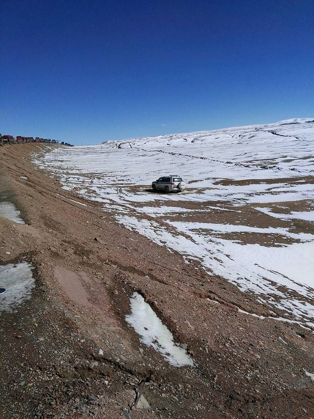 快到唐古拉山口的时候,由于货车太多,堵车了,有人开车下了公路,超过大车到前面,我们就跟了下去,反正下面是常年的冻土层,不怕陷车,下面雪地比较滑些,终于用到了四驱模式。一路下来唯一的一次,所以说去西藏,不要纠结,轿车也没问题。