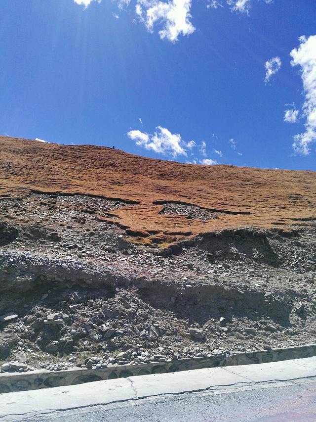 去羊湖需要两个多小时的行程,路上限速路段颇多,路况还是不错的。沿途的路基,修路应该是破坏了部分植被,这路旁光秃秃的裸露岩石不知什么时候才能恢复,绕过过这座布满苔癣的山就到了。