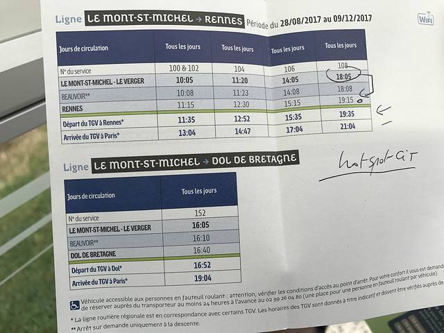 从圣米歇尔山回到巴黎,可以在游客中心外的地方乘坐BUS到雷恩换火车两个小时到巴黎的Gare de Lyon 火车站。下图是每天从圣米歇尔山到雷恩的班车,一天4班。到雷恩之后,同样绿色线下面就是相应的TGV到巴黎的火车。20分钟接驳。注意不要错过时间。