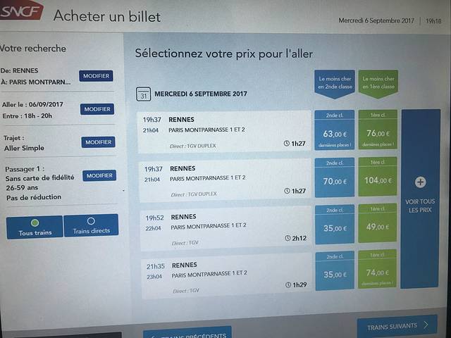 比如我这次从雷恩到巴黎的火车票,如果19:37分从雷恩出发去巴黎,21:04到,价格是63欧元和70欧元,如果不着急晚20分钟走,19:52--22:04到巴黎,就是35欧元,整整便宜一半。