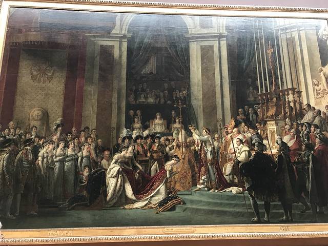 拿破仑一世加冕大典【拿破仑为了营造加冕的合法性质,特地把教皇庇护七世弄到巴黎,看这画面好像是再给自己的皇后加冕,其实是他正在举起王冠戴到了自己头上。】