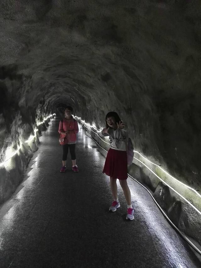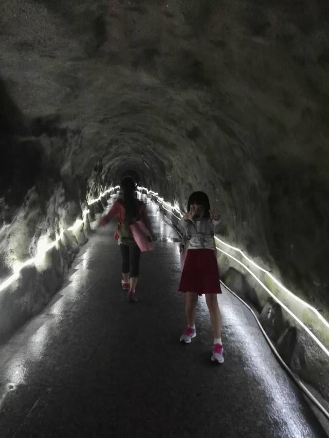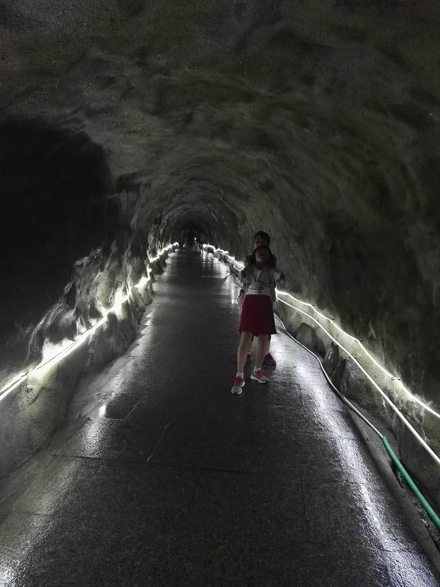 隧道里凉爽,两个小孩边走、边玩非常开心。