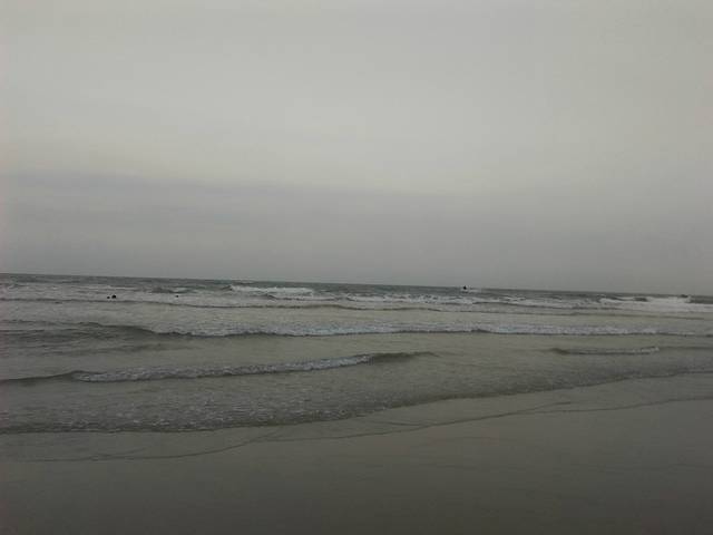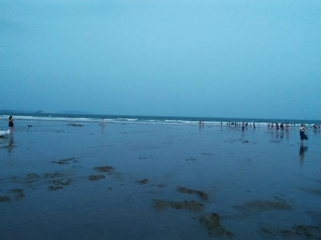 在海滩上踏浪,沙子很软很细,沿着海边走着,天都黑了。