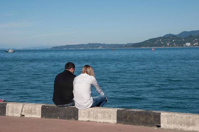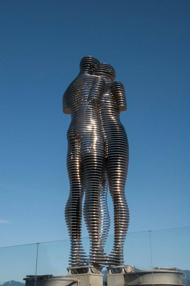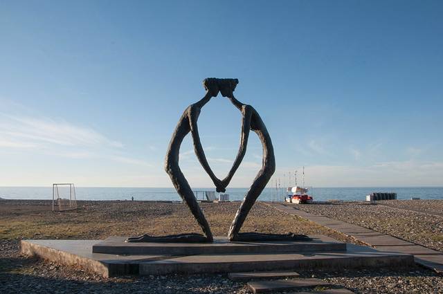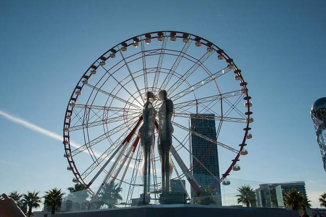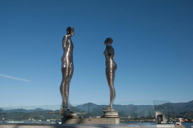 这是两尊雕塑,位于巴统黑海步行街上。这两尊雕塑来自于同名小说,讲的是一个阿塞拜疆穆斯林男孩和格鲁吉亚基督教女孩被当时的布尔什维克拆散的悲情故事。两尊雕塑每天不停地经历分与合。