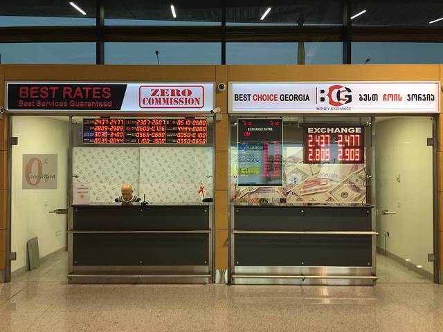1、换钱:人民币不能直接兑换拉里,必须用美元、欧元、英镑等兑换。大约汇率为:1 USD=2.47 GEL。不过像LIBERTY BANK和TBC BANK兑换不是特别的划算,大概能给到1:2.44左右。机场到达厅有很多兑换货币的地方,大家找汇率最划算的换就是了。像第比利斯、巴统、梅斯蒂亚等大的城市,兑换货币的店铺还是很多的。有的小地方,比如锡格纳吉,基本上没有能兑换货币的地方,甚至很少有商家能刷卡的。最让人不可思议的是在梅斯蒂亚,都没有能刷卡的地方。所以小伙伴们一定记得储备好足够的现金哦!