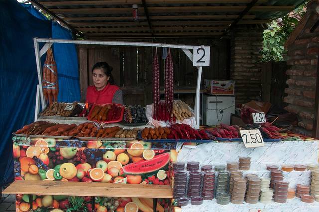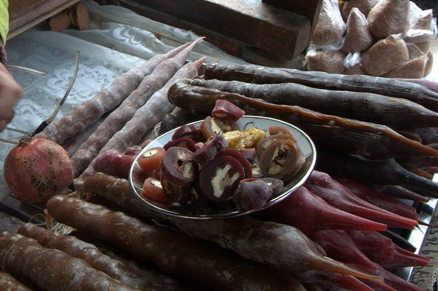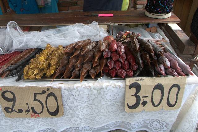 2、丘尔其赫拉 Churchkhela :格鲁吉亚有得天独厚的葡萄种植条件,所以葡萄衍生的副产品格外多。外观酷似长香肠的丘尔其赫拉就是其中一种。其主要成分是葡萄汁和面粉,加入少量杏仁、核桃、榛子和葡萄干,并拧成香肠的形状风干制成。在格鲁吉亚街头,时不时就会看到挂满一整个橱窗的丘尔其赫拉,它也是索巴狂欢节上最受人追捧的甜点。