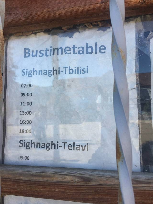 (1)锡格纳吉:在SAMGORI下车后,左侧的出站口出去就能看到一个车站,穿过这个车站会有另一个车站,这儿有前往锡格纳吉的车;如果是右侧的出站口出去,就能看到一个菜市场,穿越整个菜市场,就能看到一个车站,那里有前往锡格纳吉的车。切记:一定不要过马路哦!前往锡格纳吉的车会写英文“SIGNAGI”,而不是我们所熟知的“SIGHNAGHI”第比利斯前往锡格纳吉的大巴不是很灵活,车小人多,比较拥挤,只有9、11、13、15、17点的车,都是准时发车的,不是随满随走的,甚至人坐满了也得到点才能发车,单程票价6 GEL。虽然说17点是公认的最后一班车,但是也听有驴友说做到最晚18:30的车。。。锡格纳吉返回第比利斯的车,有7、9、11、13、16、18点的车,不过这个车要提前买票,否则到了坐车点,没提前买票的话,是无法乘车的。建议提前一天买票!售票处在警察局后面的停车场的一个小房子里面。这个售票处也是我在格鲁吉亚唯一见过的官方售票处。