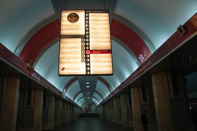 4、地铁:第比利斯地铁单程统一票价0.5 GEL,充值卡押金2 GEL,记得保留小票可以退卡,乘坐公交同样是0.5 GEL一次,多人同行可以只办一张充值卡,刷卡多次。也可用于乘坐缆车上要塞,2.5 GEL一次,如果往返则是4 GEL。PS:要坐缆车上要塞只能刷卡,不能付现金的哦!游客一般会用到STATION SQUARE-1(去火车站),LIBERTY SQUARE(去自由广场),DIDUBE(坐车去姆茨赫塔、卡兹别克等),AVLABARI(圣三一教堂、纳里卡拉要塞等),SAMGORI(坐车去锡格纳吉、梅斯蒂亚等)。关于地铁卡的退卡,只能在第比利斯的市区退,机场是不可以退卡的。