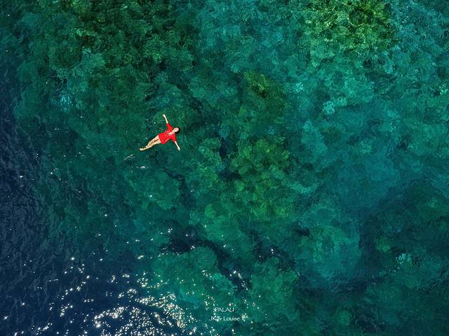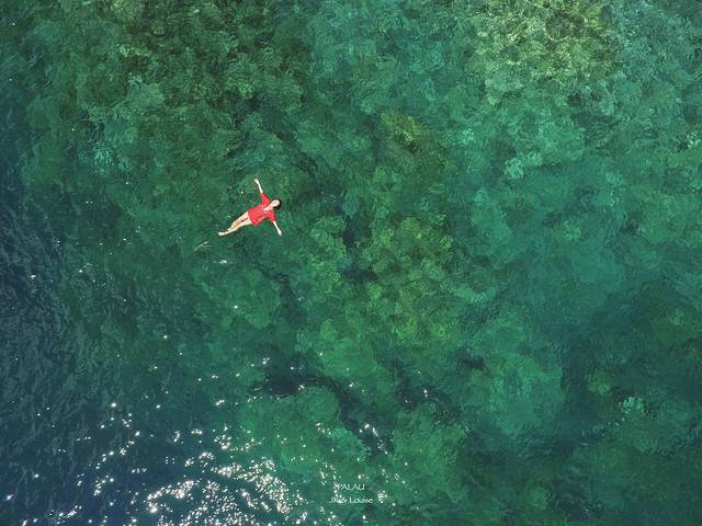 先放一张我觉得最自由的照片,这张照片是在帕劳的硬珊瑚区拍的。当时我们包的小船开到硬珊瑚区的时候周围刚好没有其他船过来浮潜,整块区域就我们一支小船,阳光刚刚好,碧绿的海面闪闪发亮。我连面镜和脚蹼都没带就扑通跳进水里游到珊瑚之上,海水的浮力就这样把我托了起来,面前是徘徊在阳光中的海鸟,包围我的是清澈见底的海水,背后是成片的玫瑰珊瑚和鱼群,我就这样躺在太平洋上,大口呼吸着阳光。当时在玩航拍器的JK就帮我把这一幕记录下来了,这不是最好的照片,却是我最喜欢的照片,到现在,我依然能想起躺在海面上那自由自在的感觉。