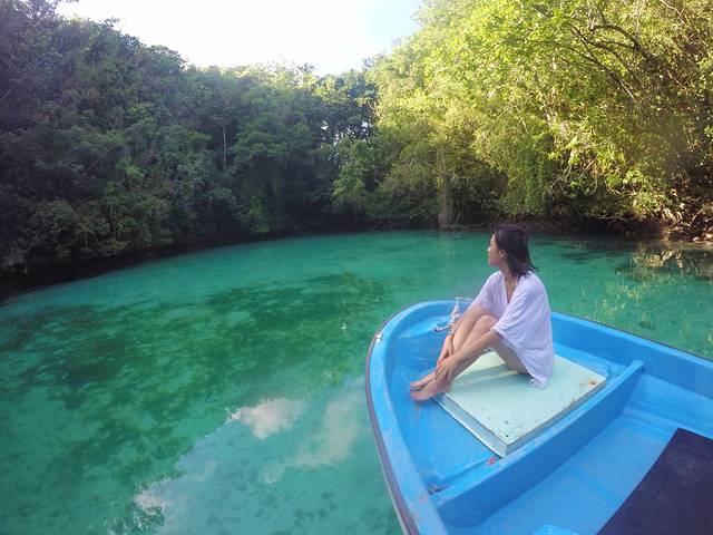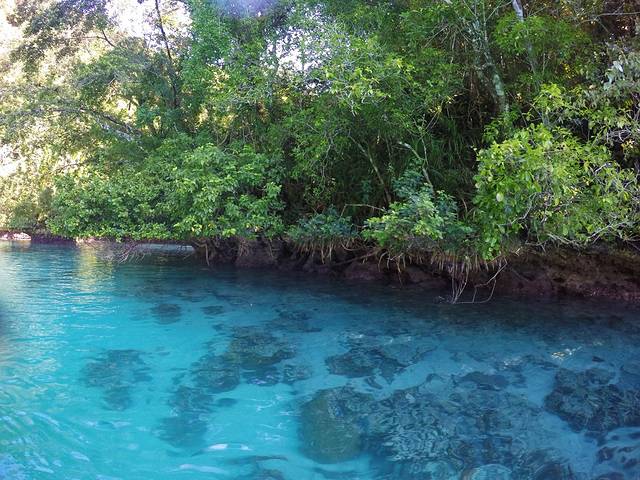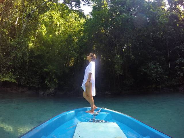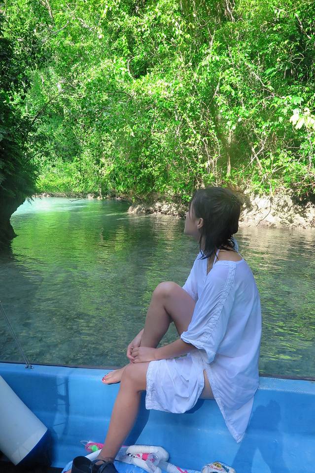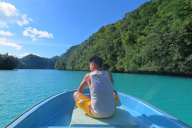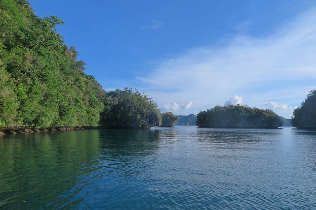 船长的第一个秘密基地是一个藏得很深的小海湾,跟之前去的秘密水母湖差不多,都是入口很小,里面却别有洞天的小地方,船长说这里是baby shark的栖息地。他说鲨鱼会来这个地方生小鲨鱼,等小鲨鱼长大后就会游回海洋。船长把船开进海湾入口后就关掉了发动机,任凭船只缓缓滑行。少了发动机的噪音,海湾的轮廓更加清晰,环绕在我们周围的是水声,风声和鸟叫声,其中有一种很特别的叫声,船长说那是果蝠的叫声。我们在这里停留了片刻,最终也没有看到小鲨鱼。后来船长还连续带我们去了另外两个这样的小海湾,也依然没有看到小鲨鱼的踪迹。不过我个人非常喜欢这样静谧的海湾,我喜欢船只关掉发动机随波逐流,我更愿意听到这真真切切来自大自然的声音。