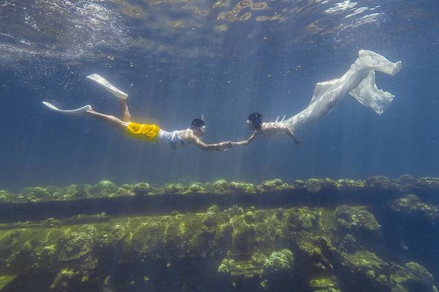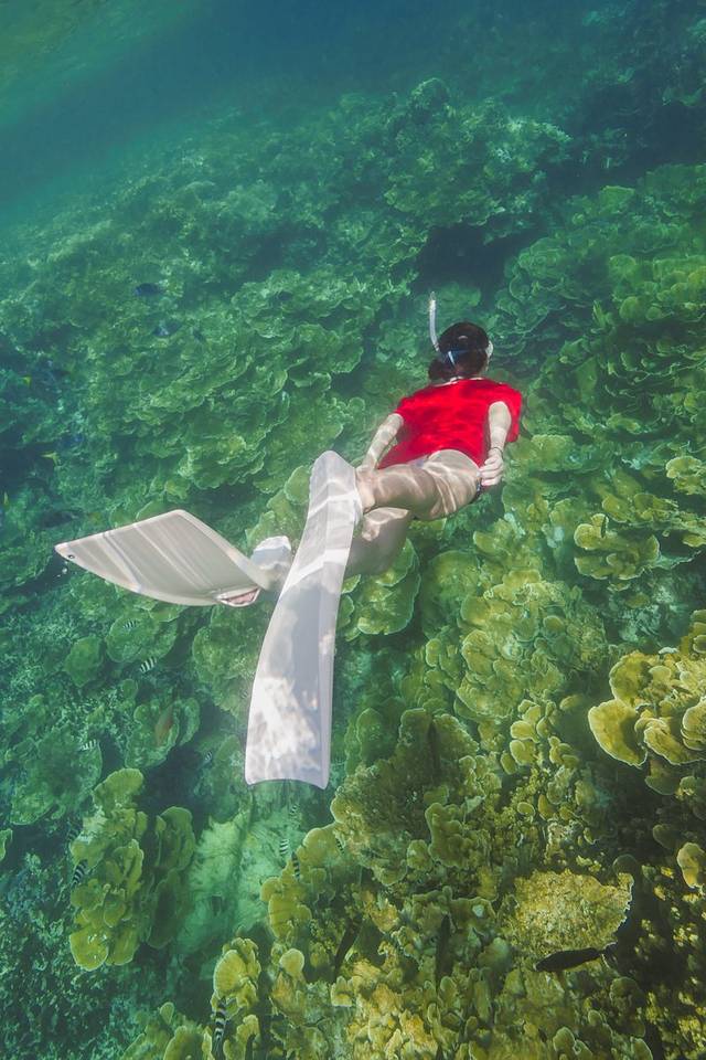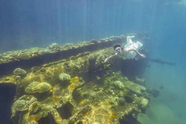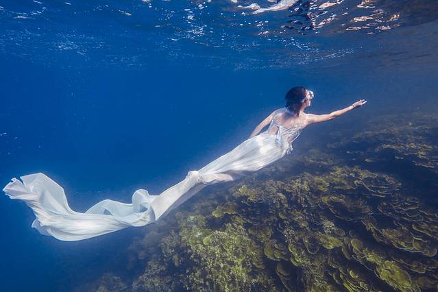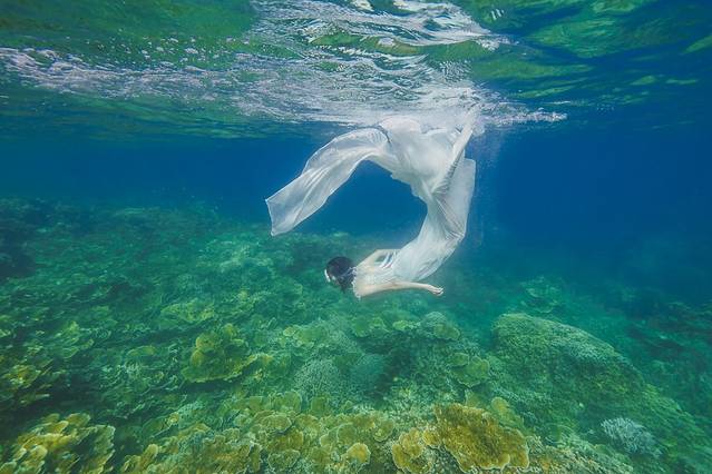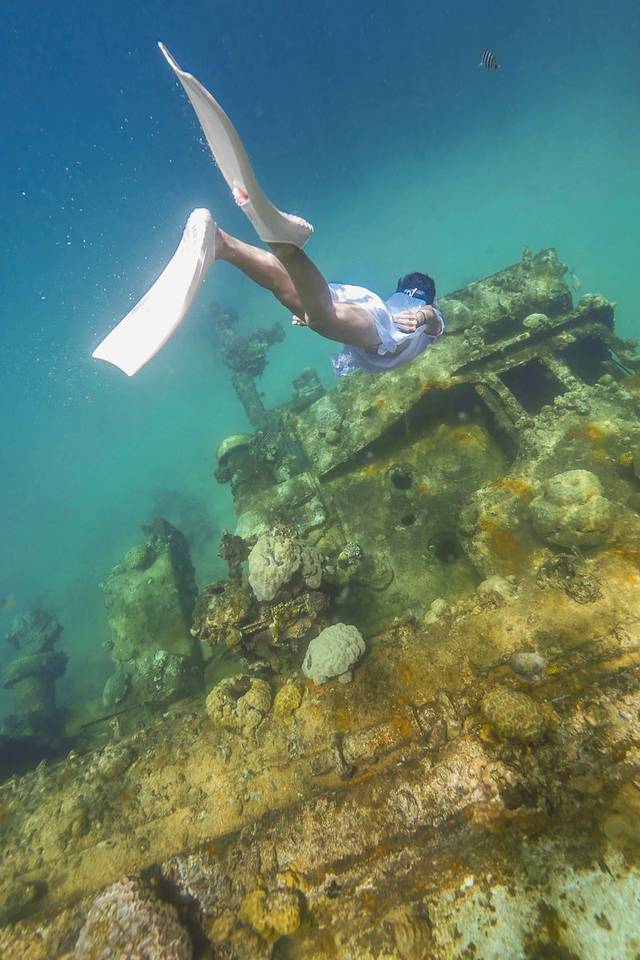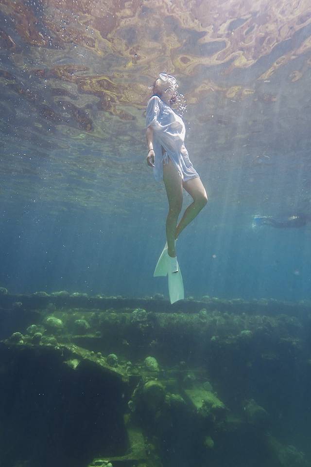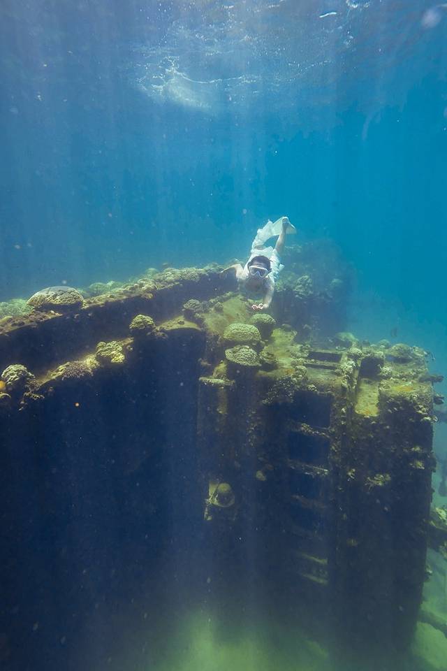 其实我原本是想拍从颓废沉船里游出来的新娘这种很有画面感的照片,然而穿着长裙的我根本根本潜不下去·····果然还是露出双腿比较自由!