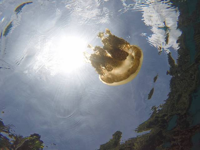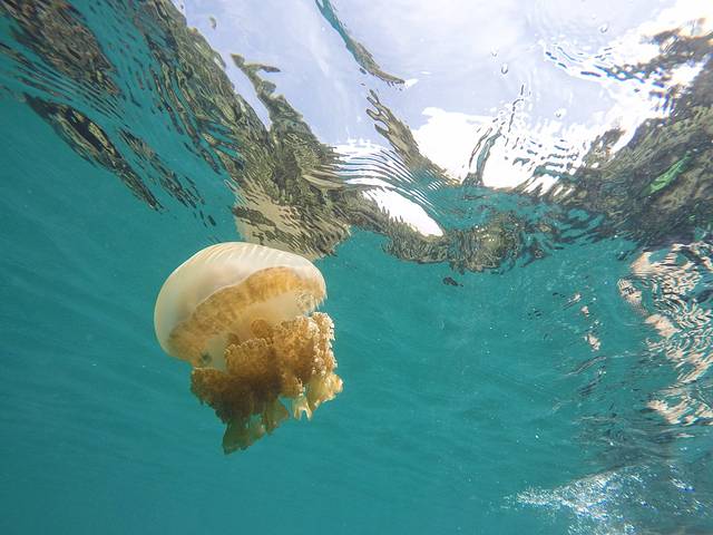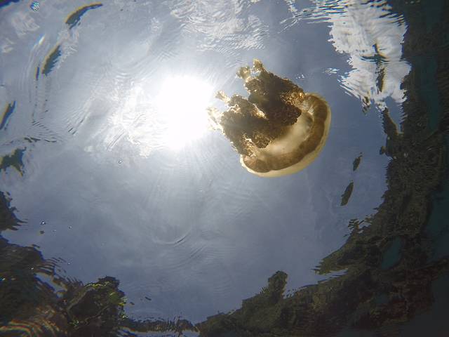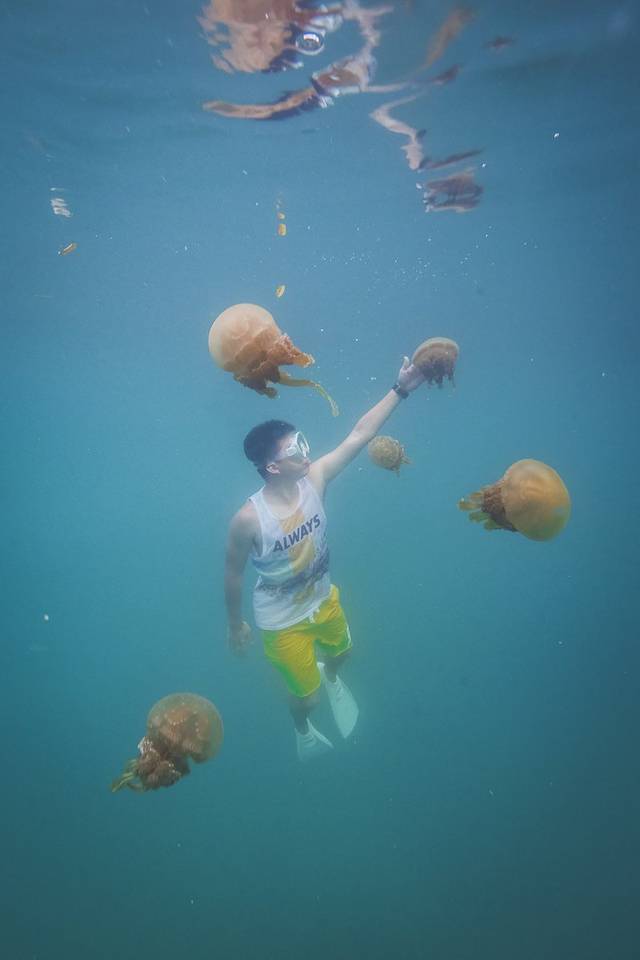 而这次Steve带我们去了一个秘密水母湖,这是一个船能直接开进去的小海湾,海湾的入口很窄很浅,大约只够两只船并排同行的宽度,而且入口处的珊瑚特别高水特别浅,点稍微大一点的船只可能都会搁浅在这里。正式因为这样相对封闭的自然环境,才让这个海湾能留住一小部分水母,变成Steve口中的秘密水母湖。然而这里的水母虽然挺大只,但是数量却很稀疏,和昔日黄金水母湖的水母密度没法比,要想水母密度恢复到之前的水平,估计要等个一两年吧。