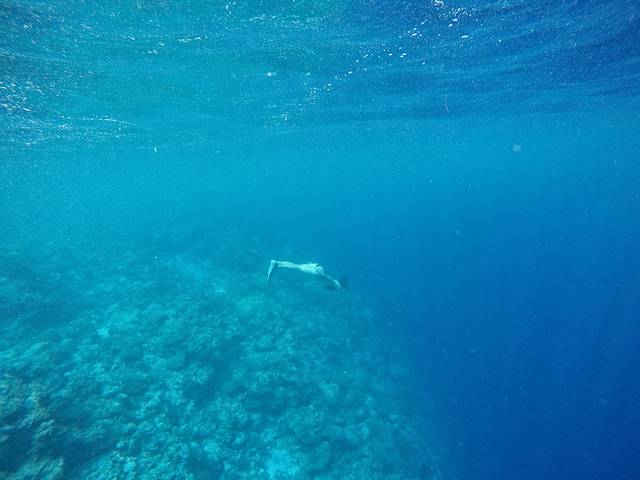 既然来到了大断层,当然不能浪费眼前的美景,草草吃了几口饭之后,我就脱掉湿衣,带上脚蹼和面镜跃入海中。说到断层就是岸边的一个浅滩突然断崖式地竖直向下延伸的海下山崖,去年在诗巴丹也看过不少断层,不过当时是深潜,我们一行人就在断层的二三十米深的地方挨着峭壁前行。而这次是来大断层浮潜,感觉完全不一样呢!深潜的话应为整个都融入海里,贴着峭壁前行的时候眼睛也只会注意峭壁上的珊瑚和鱼群。而浮潜的时候,当我从浅滩游到断崖向下看的时候,居然有那么一刹那以为自己要掉下去了,这深不见底的大断层之下会不会藏着些什么妖魔鬼怪呢!会不会有深海章鱼把我拖到海底呢!果然未知才会觉得害怕!