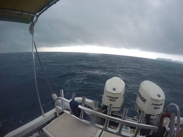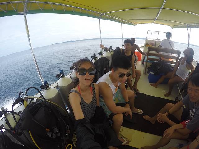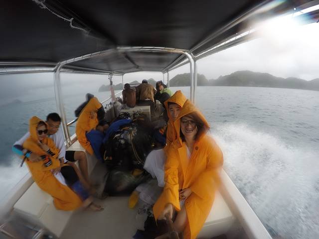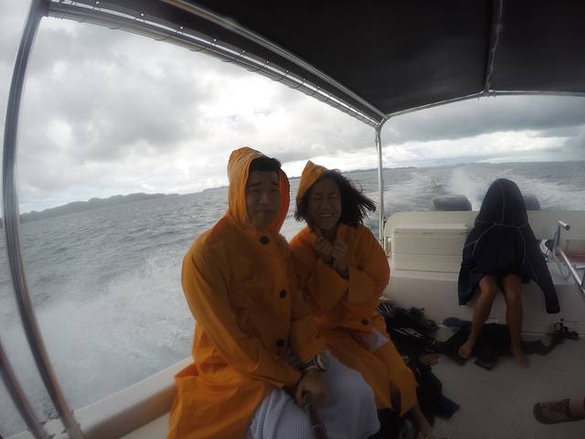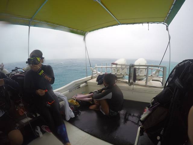今天天气不是很好,多云,出海前Joanna就预感说今天出海可能会下雨,结果午饭后果然下起了大雨,我们的小快艇就在狂风暴雨中乘风破浪,面对这样恶劣的天气我依然能拿起gopro自拍,后来翻看照片的我都被自己感动了。看到这个画面,完全不能相信上午还是个大晴天,而当时的唯一感觉就是很冷!很冷!很冷!将这个故事就是为了提醒大家和未来还要去潜水的自己,出海一定要带多几条毛巾和保暖的风衣,雨衣一般船上都会有提供,而坐在船头的潜导Steve时不时就会回头鼓励我们一句说我们很快就会冲出这片雨云了!