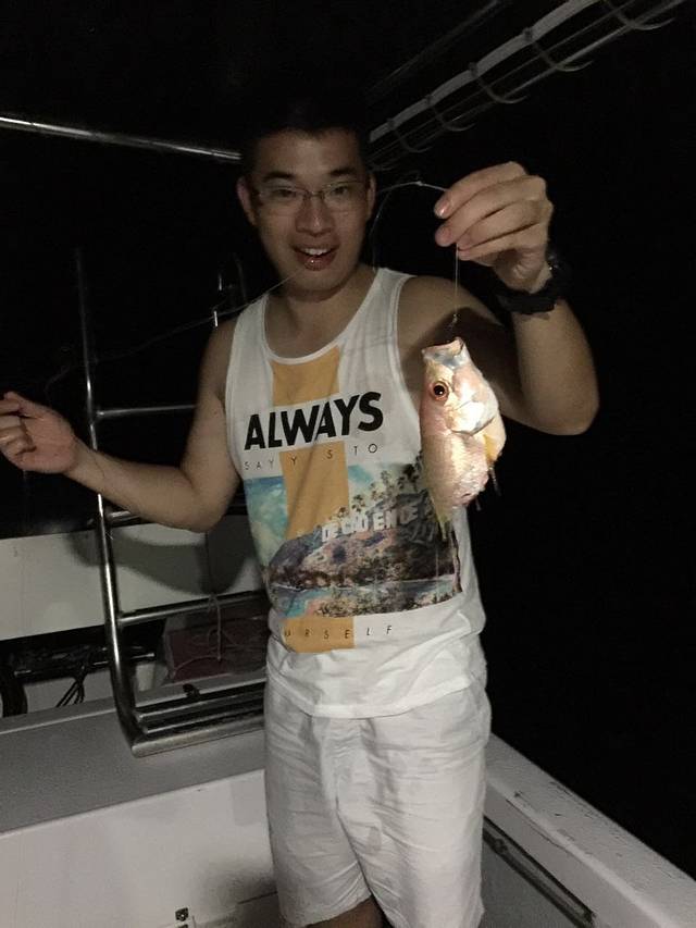 船长说,鲨鱼发现我们后我们就要换地方了,不然这片海域有鲨鱼出没,我们是很难钓上鱼的,后来换了地方,我居然钓上来一条平时喜欢贴着鲨鱼前行的那种扁扁的鱼,所以鲨鱼依然跟着我们吗···期间同行的一个小伙伴勾到一条大鱼,一个大男生用尽所有的气力也拉不上来,双方对峙直到鱼线被拉断,这又是一条怎么样的庞然大物呢?尽情脑补吧!