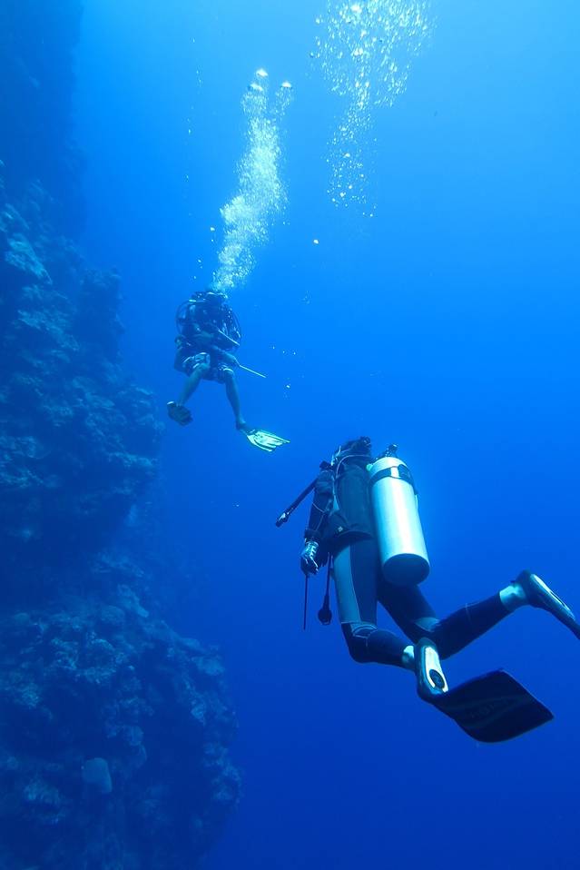 游出了蓝洞就是一片开阔的海域,我们就沿着这堵峭壁慢慢前行上浮。