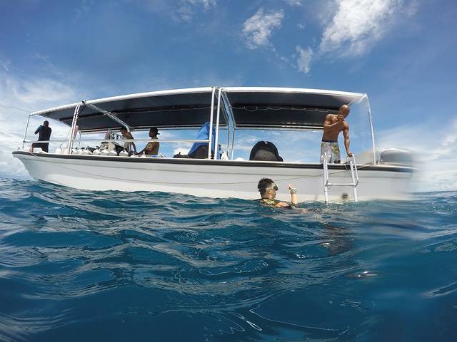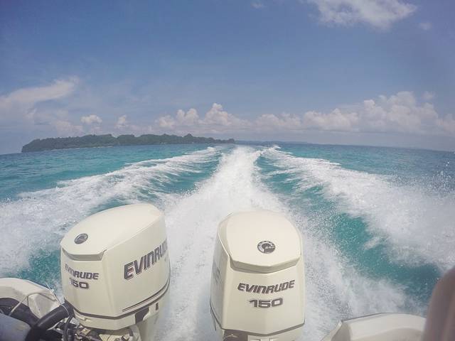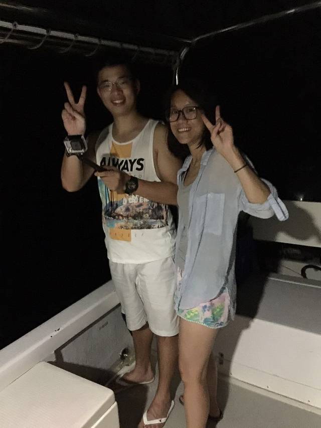 傍晚回hi resort洗了个澡换了件衣服,发了个朋友圈(号称帕劳全国最快的网速发了9张图用了半小时呵呵!),然后我们就准备去夜钓了!一起海钓的还有跟我们一起潜水潜了三天的厦门夫妇,还有另外一对夫妇是他们的朋友。大约七点半的样子我们重新回到出海的码头,我们出海的小船已经整装待发,船上有一名船只和一名船员,还准备了大量饮用水和鱼饵。