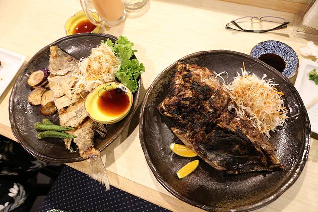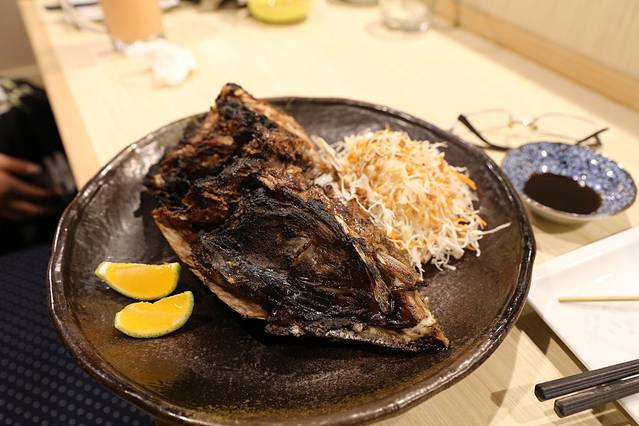 这盘黑黑的不明物体被端到大连夫妇的面前时,我还哈哈哈地问他们点的这事啥黑暗料理,他们也是一头雾水地说估计是那条炸鱼吧。话还没讲完,服务生就过来说上错菜了,这盘黑暗料理是笨jk点的烤三文鱼头!什么鬼!好暗黑啊!
