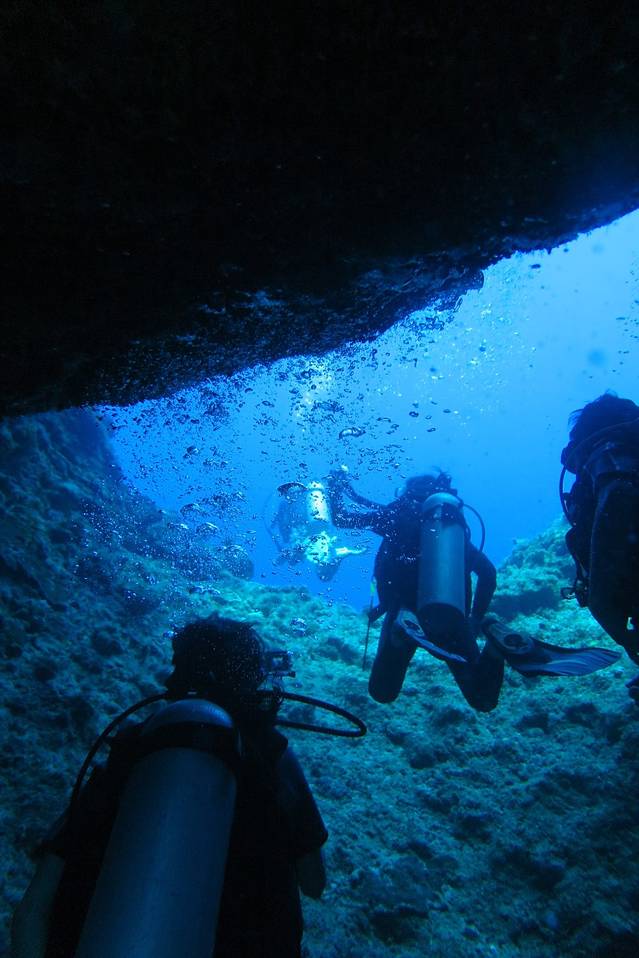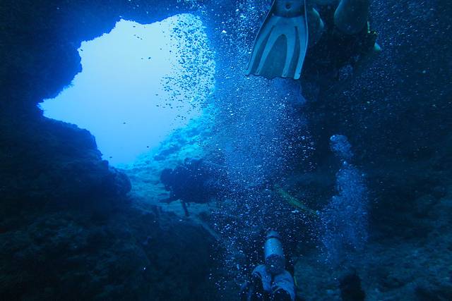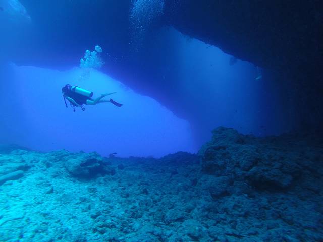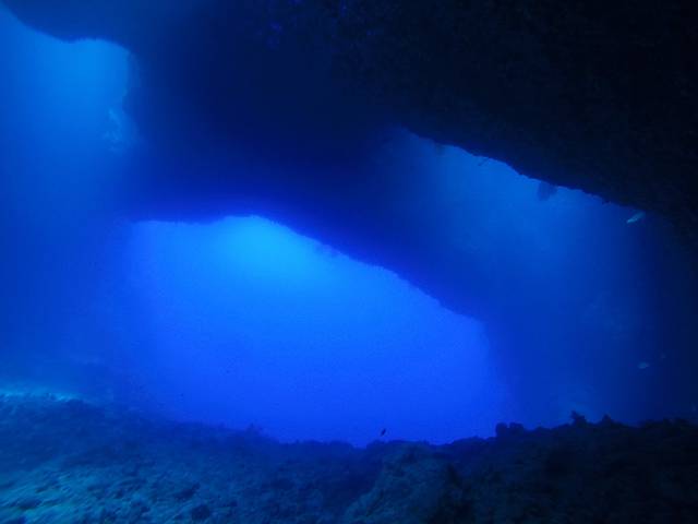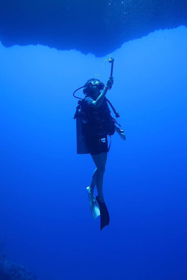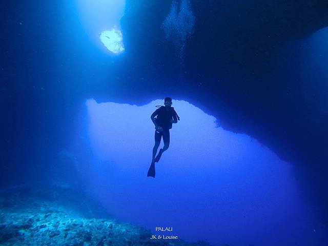 帕劳的蓝洞其实一共有五个洞,五个洞是联通的,其中三个洞是朝向海面的方向,所以阳光可以通过这三个洞照亮洞穴,在洞穴里就像看到上帝之光一样。而我们的潜行轨道就是先下水从最深的那个大洞进蓝洞,在里面玩一会儿就从侧面的一个小洞出去,然后沿着峭壁慢慢前行上浮,最后结束。