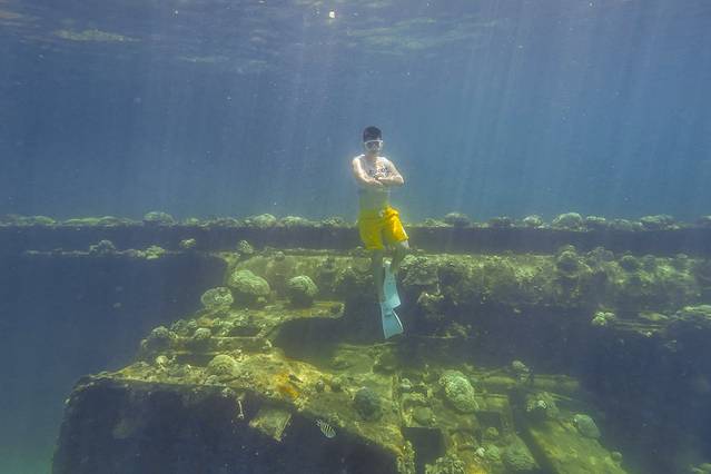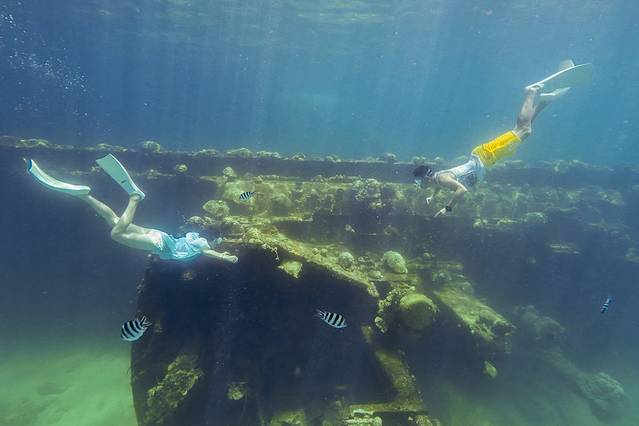 离码头不远处就有一处浮潜的小沉船,作为我们的第一个点。我们出发时间算是比较晚了,刚刚到沉船得点的时候被眼前下饺子的场景给吓呆了。周围大约停泊了十艘小船,一船大约有十个人,所以目测这艘小沉船上大约就聚集了几十人。我真后悔没能早点出发。。。不过包船的好处在这个时候就显现了,我们也没急着下水,就在船上呆了半个小时左右,这十几艘船就陆陆续续开往下一个潜点了,然后这个沉船就被我们承包了嘿嘿。