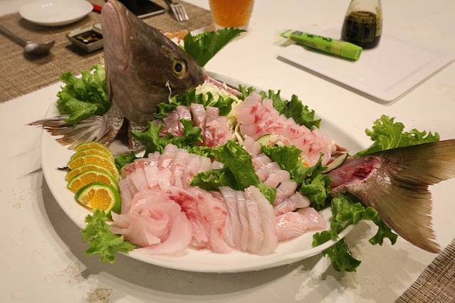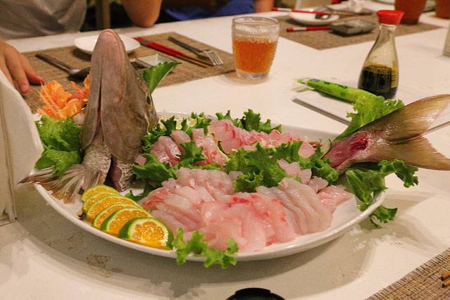 这是船上小伙伴钓起来的大红昌鱼,超级大条,船员当场就帮我们把它切成了两碟刺身,这是其中一碟,晚饭开始!剩下的鱼本来打算回hi resort煮来了吃了,可惜回去的时候已经很晚了,也就作罢。