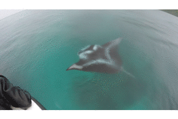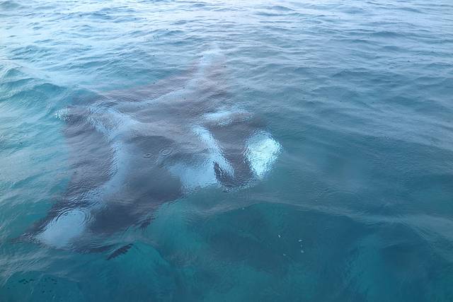 大约追了半个小时的海豚,Steve提出我们要继续向着第三个潜点前进,大家依依不舍地跟海豚道别后(可能海豚终于松了一口气了),各自回到自己位置上开始翻看刚刚拍的照片。然而,我们凳子都还没坐热,船头的Steve又回头喊了一句:Manta!