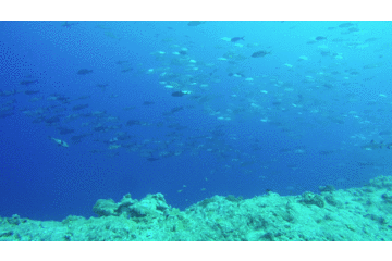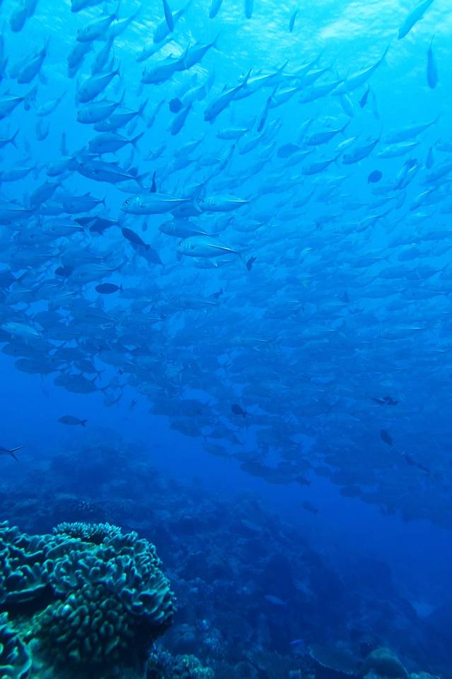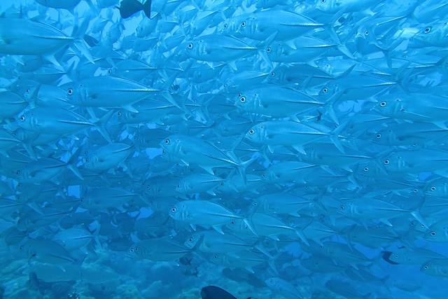 再用一张图诠释一下这片海域的鱼群密度,如果没有成群的鲨鱼,光是看这片海域鱼群的密度也是一道惊人的风景!照片里这些黑黑的东西全是鱼!而且有许许多多的品种成群结队地游!这简直就是鲨鱼的大饭堂啊!难怪这里聚集了这么多鲨鱼!脑补了一下鲨鱼们对话的情景大概是这样的:走啊哥们儿!今天咱去蓝角吃自助餐!哈哈哈!