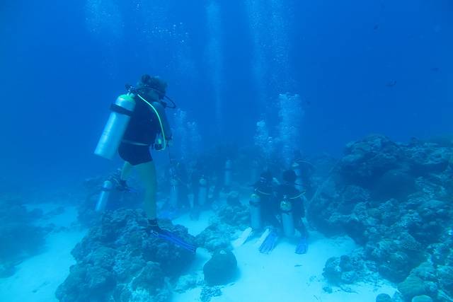 言归正传,因为今天天气不太好加上一些其它的突发原因,我们去的潜点都是一些比较无趣的点,刚好就当给一年没潜水的我们先上了一堂复习课。第一潜Joanna带着我们四个学aow的学员在做了一个35m左右的深潜课程,第二潜还因为水下流太大,我们几乎什么都没看到就被吹跑了,结果就只做了一个三角水底导航的练习就上来了。