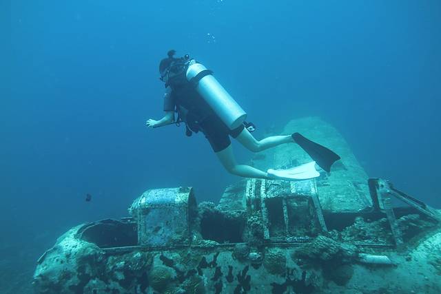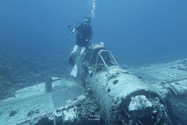 今天的第一潜也是看二战的水下残骸,下水前Steve介绍说这个水下有一台飞机的残骸,当时在这片海域的上空被击中而坠落,然而飞行员当时却成功逃生活了下来,后来这个飞行员每年都要来这个地方潜水看看自己当时的坐骑,然后拖着周围的人跟他们说这就是我当时开的飞机然后顺便感慨一下人生。这明明是个令人感慨的故事,为什么我听完会觉得有点搞笑。
