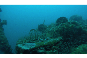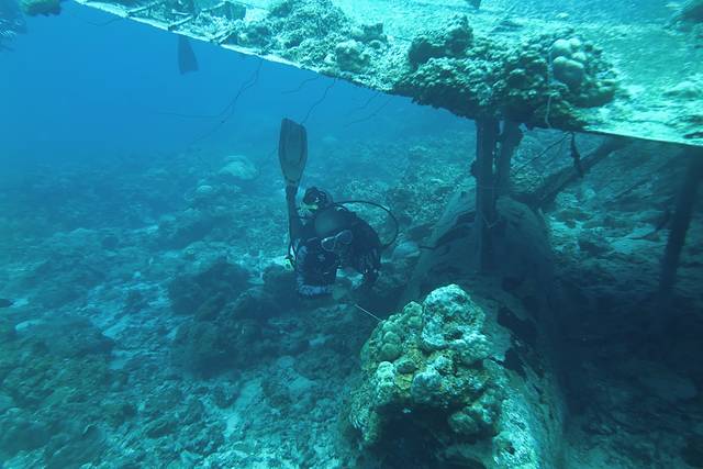 今天的最后一个潜点是看一个大沉船,这大约是一个战争时期运送弹药的货轮吧。船只很巨大,还能看到很多枪支弹药,高大的桅杆直指海面,仿佛心有不甘地想要重新回到海面扬帆起航,有多少悲伤和无奈的故事都伴着这艘庞然大物石沉大海。我们所看到的就只剩下历史遗留下的悲凉和颓废,大船在海水和时间的侵蚀下早已旧迹斑斑千疮百孔。然而它却给海底的珊瑚提供了一个舒适的温床,珊瑚的生长引来了不少小鱼,这只仿佛被时间遗弃的冰冷废铁也变得柔和起来,或许也是有了珊瑚也鱼群的陪伴,这艘大沉船才显得并不那么寂寞了。