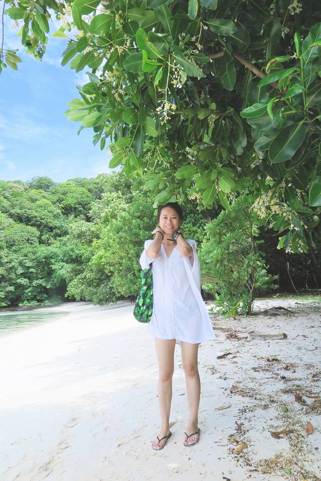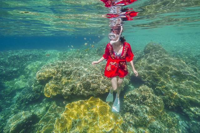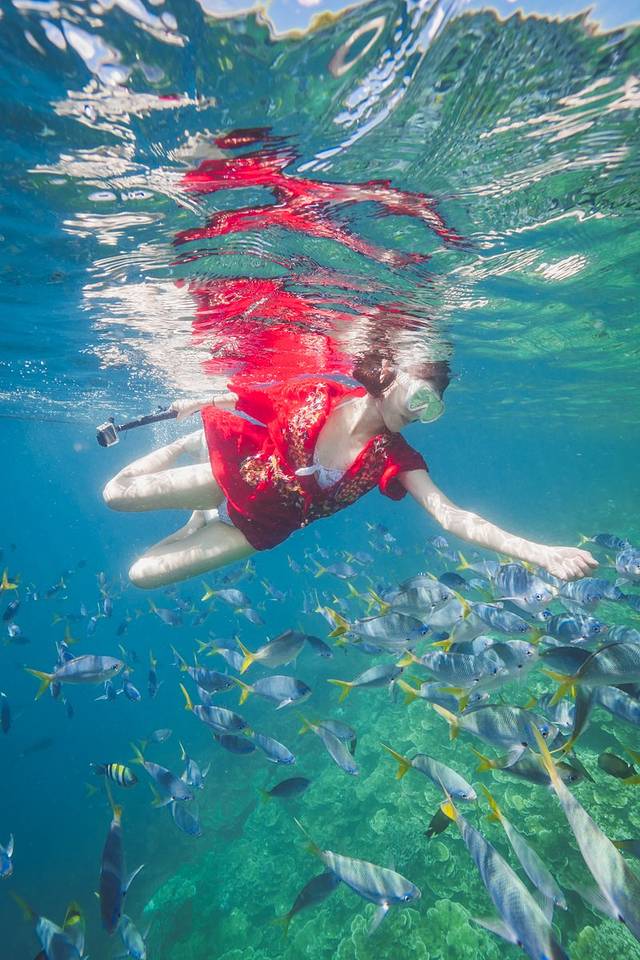 这里真的要提醒大家,如果要穿长裙下水,周围一定要有一名很会游泳的人在身边,你的摄影师也好,船员也好,一定一定要有人在你身边盯着你。我自认为游泳还是挺不错的,可是穿着长裙下水却依然很狼狈。因为裙子会缠脚!看下图,长裙已经是狠狠缠在我的腿上了,穿着脚蹼也根本没有用!虽然用不了腿,我用手也一样能游回海面,但真的很累人,穿着裙子在海里折腾了几个回合我已经觉得饿了·