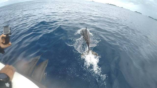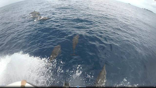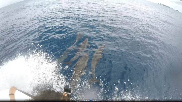 风雨之后就是人品大爆发之时,我们的快艇在开往第三个潜点的途中突然慢了下来,Steve回头说了一句:dolphins!