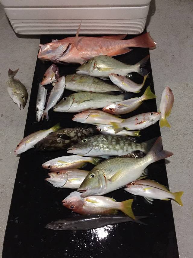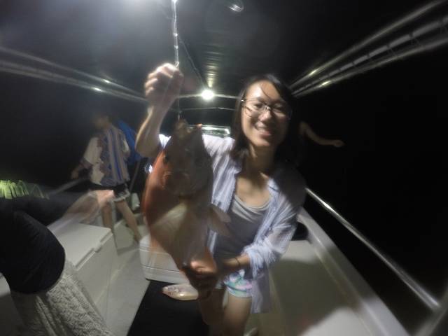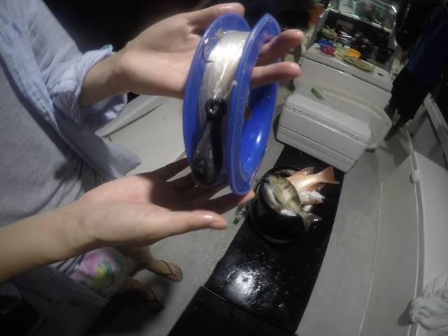OK!Light on!船长粗犷的声音直接把我拉回到现实,原本在岸上觉得光线严重不足的小顶灯在被打开的那一刻差点刺瞎了我的眼··· 准备开始海钓!帕劳传统钓鱼的工具就是一捆比较粗的鱼线,大约有三十秒长左右,在鱼线的最下端有一小块秤砣,秤砣稍上的十厘米的地方有一小节鱼线帮着一个鱼钩。然后我们只需要在鱼钩上挂上小鱼诱饵,然后直接将秤砣抛下海,秤砣带着鱼饵和鱼线一路下沉,直到触到海底礁石为止。然后我们要稍微拉紧鱼线,又不能把秤砣扯离海底,此时的鱼饵就飘在离海底10厘米处的地方随着海流飘荡。一旦感觉到有鱼在吃饵,就要全力快速地把鱼线扯上来,20米。。。10米。。。原本呆在30米处的鱼在一瞬间被你扯到了10米的地方时,因为来不及适应压力的变化,它的眼睛和内脏有可能爆出来,同时它也无力再继续挣扎了,所以最主要是快!
