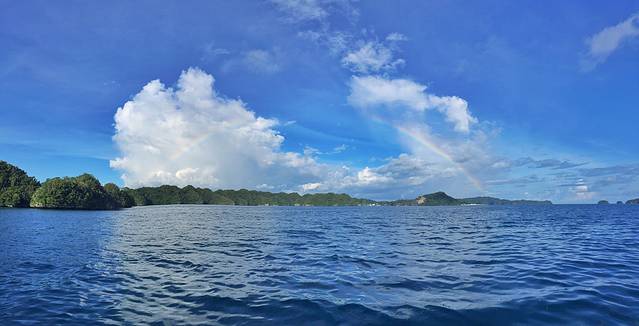 两潜过后,我们的小快艇开到了一个无人岛上吃午饭,中午饭是由潜店提供的便当。帕劳有许许多多这样的无人岛,其中一些离潜点比较近的无人岛就被开发起来,搭上了小棚子,摆上了座椅板凳,给在周围潜点潜水或者浮潜的游客提供一个中午用餐的地方。这个小岛上空还是晴朗天气,而远处的海域却已经是乌云密布了,海岛的天气果然是无法琢磨难以预测啊。