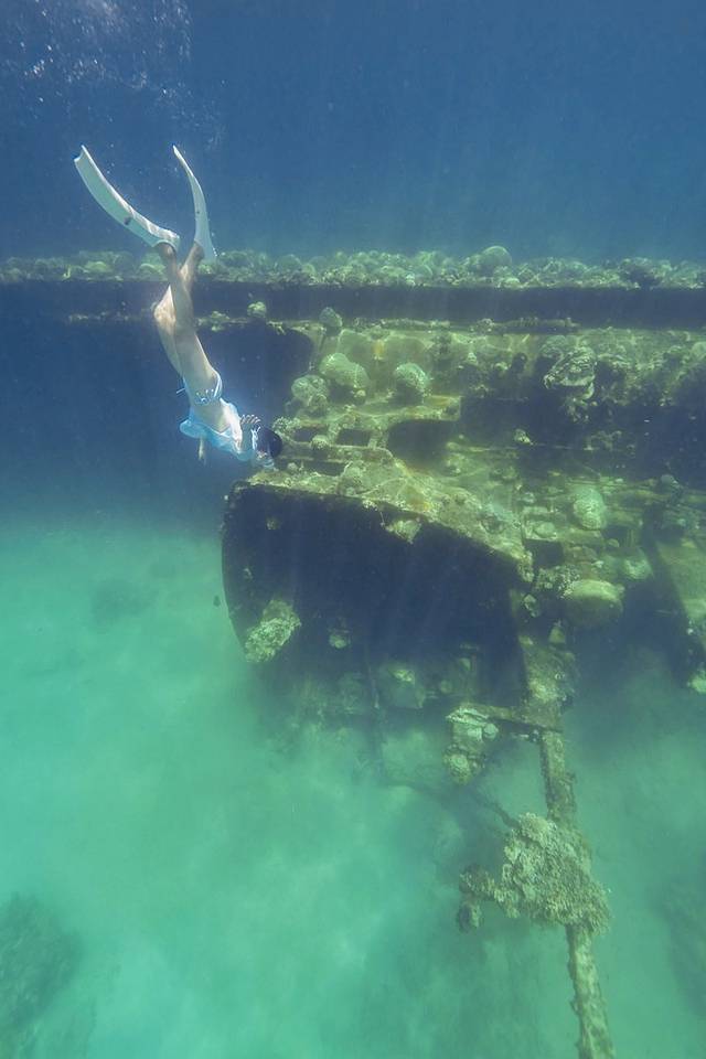 玩了一会儿沉船附近几乎已经没有其他人了,我赶紧上船换上我的白裙子跳下水。之前看过很多穿着裙子下水的照片,在海浪中飘扬的裙摆真的是美到不行,所以这次一定要尝试一次。