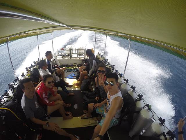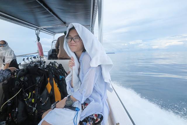 出海一定要多带几条毛巾,我们第一天出去没经验,一人只带了一条毛巾,结果一天三潜,后两潜上来只能裹湿毛巾了。快艇出海最好带一件风衣,不然就只能像我这样拿毛巾裹头了,如果强行拿掉毛巾来拍照的话,结果就是头发衣服什么的被吹得乱七八糟,眼镜也完全睁不开呵呵。