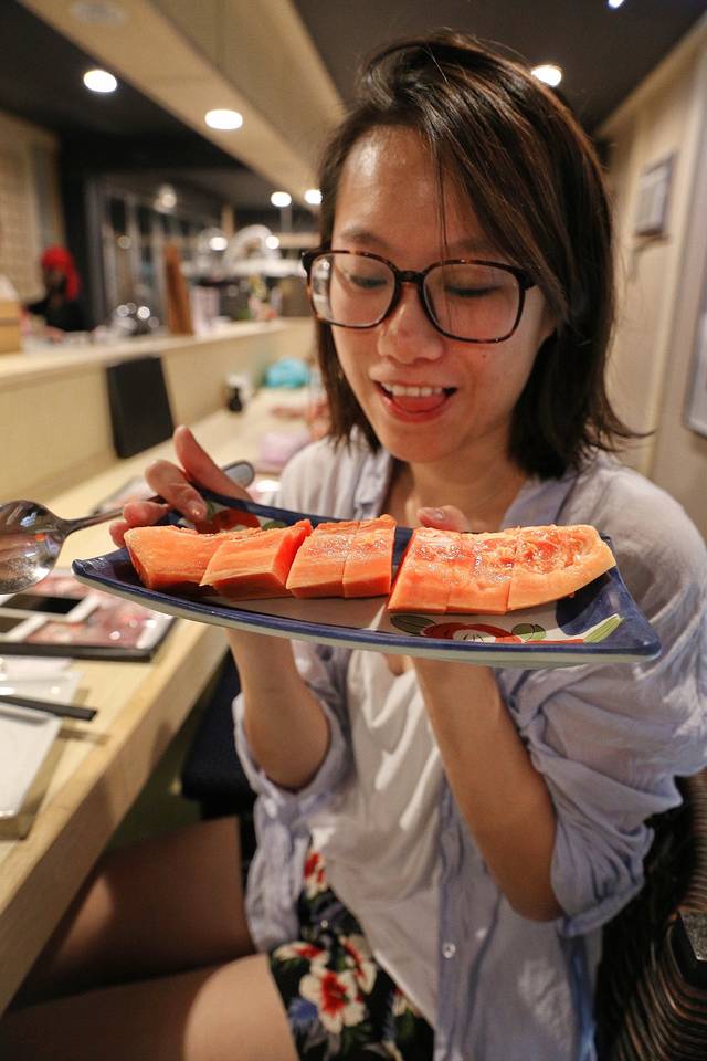 来帕劳之前大致了解了一下帕劳的饮食,最最特色的东西大概是果蝠汤和椰子蟹了吧。然而对于外貌狰狞的果蝠汤我实在没兴趣,据Joanna说喝起来就跟鸽子汤一样。然后椰子蟹太贵,吃不起,也作罢。然后因为帕劳曾经被日本占领过,因此这里的日料做得特别好(弱弱地觉得日料的精髓不就是刺身吗,身为一个岛国拥有新鲜的鱼就已经成功一大半了),来帕劳吃日料可能是最划算的选择了。