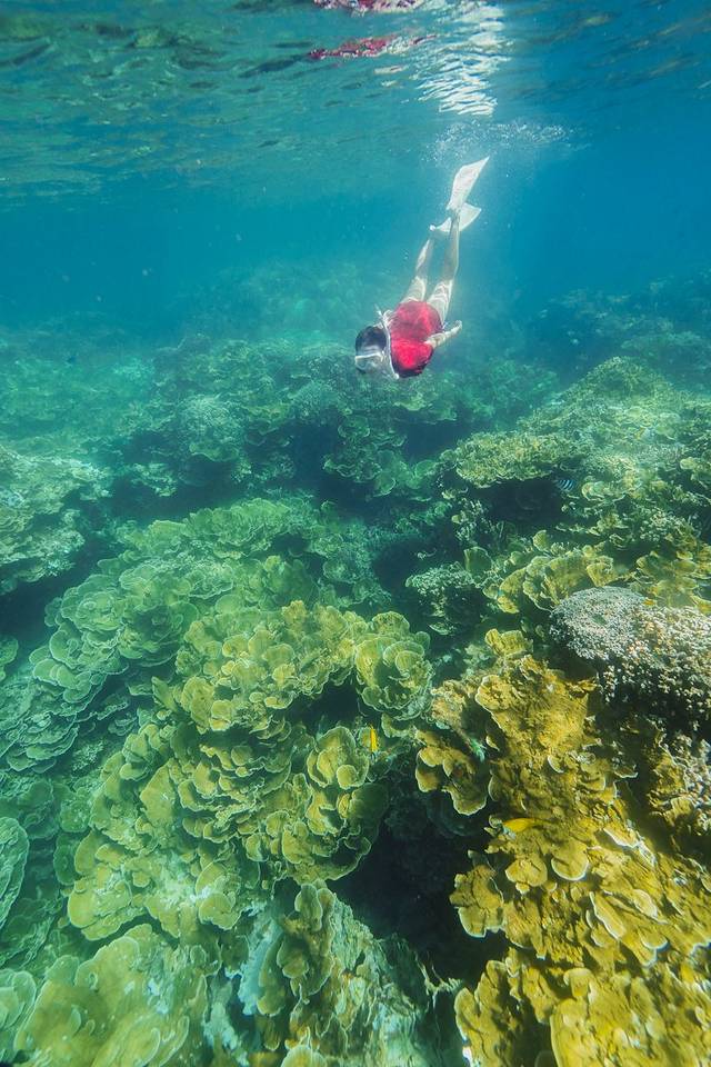 午饭后我们来到了硬珊瑚区,这个潜点下面是一大片玫瑰珊瑚。我们来的时候时间尚早,整一片区域只有我们一条船,周围徘徊者很多海鸟,正午的太阳把海水照得更加清澈透明。我们就在在这个地方放了无人机,随着镜头的慢慢拉升,我终于用上帝的视觉看清了我们所在的地方美得那么不公平。如此良辰美景怎能浪费!我故意不带面镜和脚蹼,直接跳进水里,感受海水最原始的拥抱。如果不是有船长他们在,我几乎想要脱光衣服下水裸泳哈哈哈!