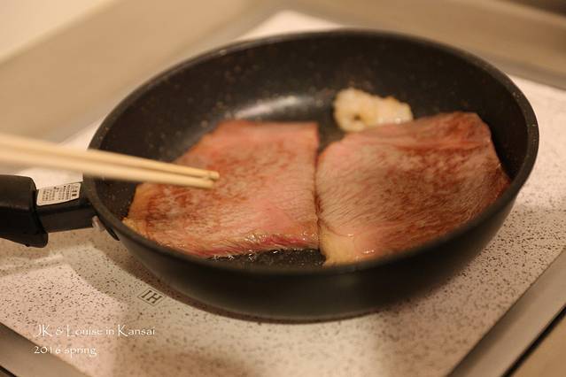 放下第一和牛双面煎,因为民宿提供的平底锅太小,无奈我只能把牛切成两半来煎。煎好的牛排一定要放在一边稍微凉一下再切,不然刚煎好就切很容易散掉。