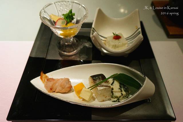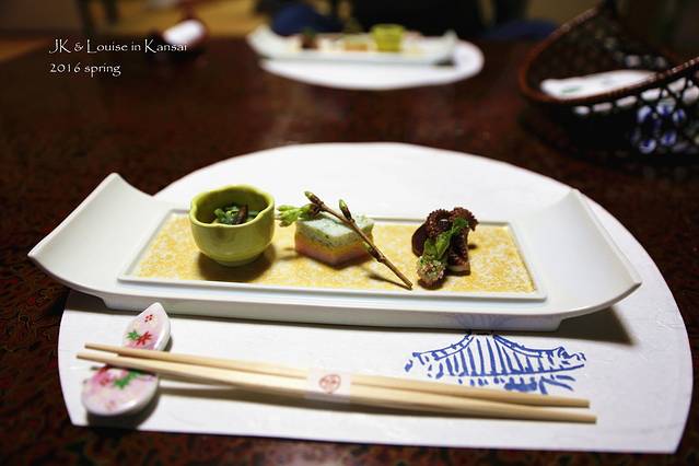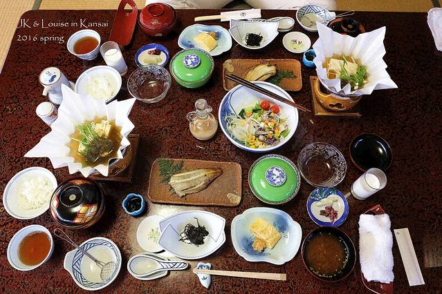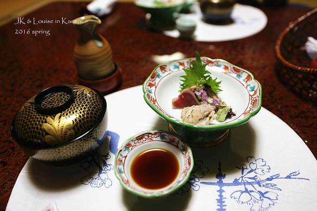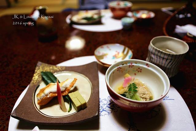 晚餐是吃旅馆提供的会席料理。会席料理是日本代表性的宴请用料理,是宴席上所有料理的总称。女将细心把食物一份一份的端上来,然后退出去,预计我们快吃完了就会进来上下一道菜。料理的内容会根据季节选用当季的食材,吃会席料理要抱有一种欣赏的态度看待眼前的食物,它餐具和排盘都非常讲究应季,比如现在春天就会放上樱花以及把食物做成樱花的形状。至于味道就是非常经典的日料的味道,至于吃到什么···不要在意那些细节···认真你就输了!只需要好好享受旅馆的服务,好好欣赏眼前的食物就好!