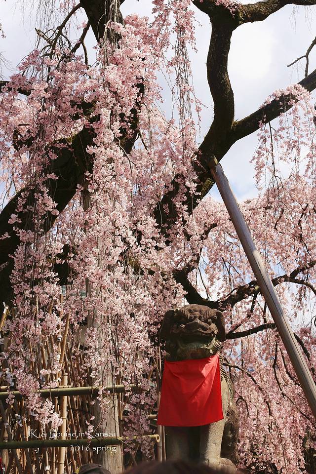 回奈良公园的路上我们路过了冰室神社,因为神社俸的是冰之神,所以那些制冰业和冷冻业的人都会来此参拜。冰室神社非常小,但它门口的一棵巨大的垂柳樱却十分耀眼醒目,而且这棵垂柳樱是奈良开得最早的樱花,被称作奈良一番樱。