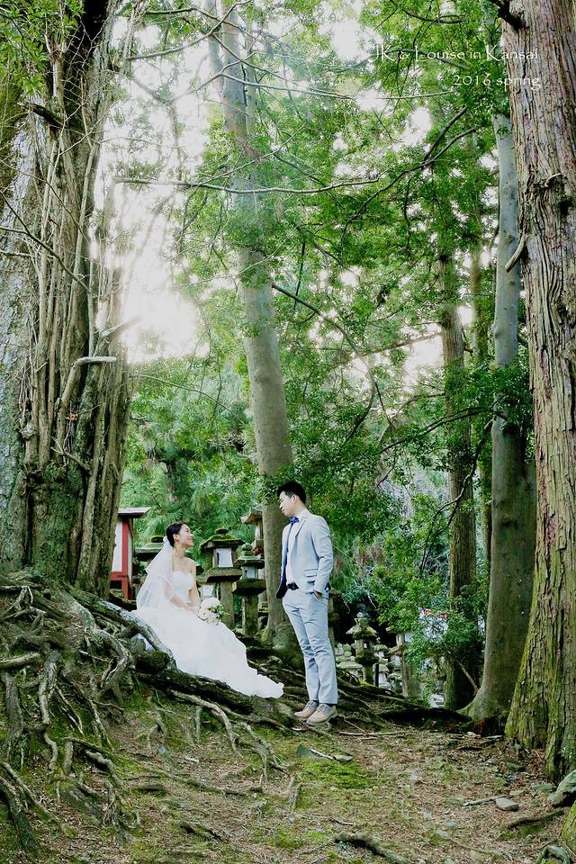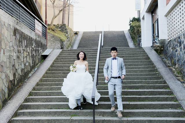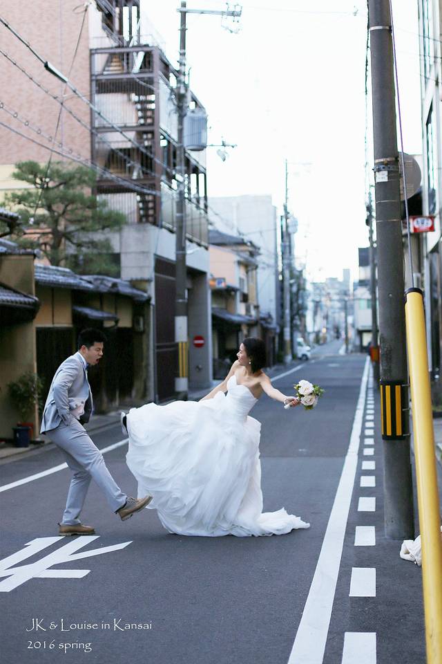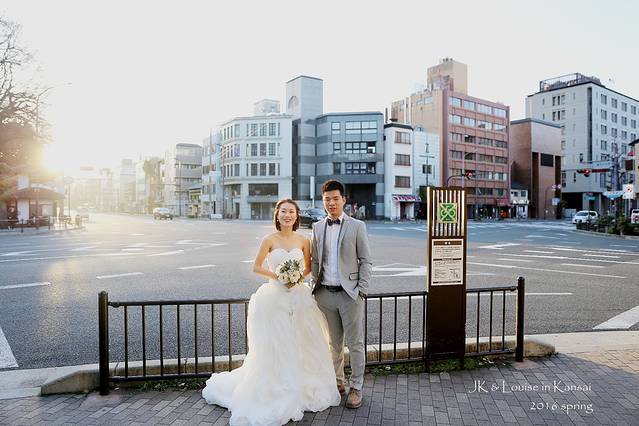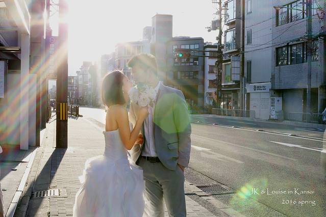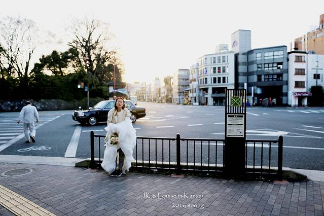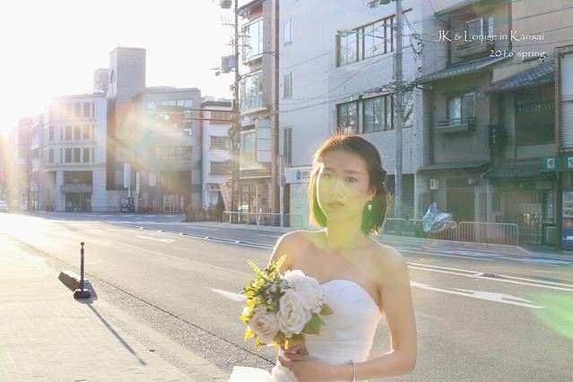 清晨5点左右,我们就起来准备自拍婚纱照的东西了。因为是自拍,所以调试相机啊化妆啊梳头啊穿婚纱什么都要自己来,还要赶在天彻底亮之前出门。比较京都也算是都市,每天早上还以会有上班上学的人群,作为尴尬症晚期患者,我是绝对忍受不了提着婚纱在人群中满街跑的。因此我们打算早上一小时内速战速决。谁知道天不随人意,位置找好了三脚架摆好了,相机遥控器却突然失灵了。JK手忙脚乱地开始各种调试找原因,穿婚纱行动不便的我就独自在零度的风中萧瑟···
