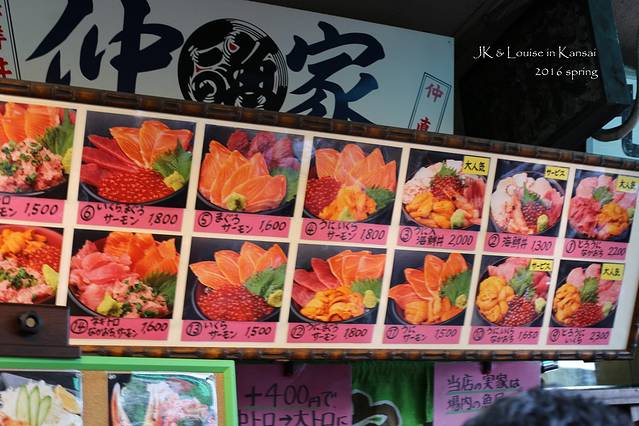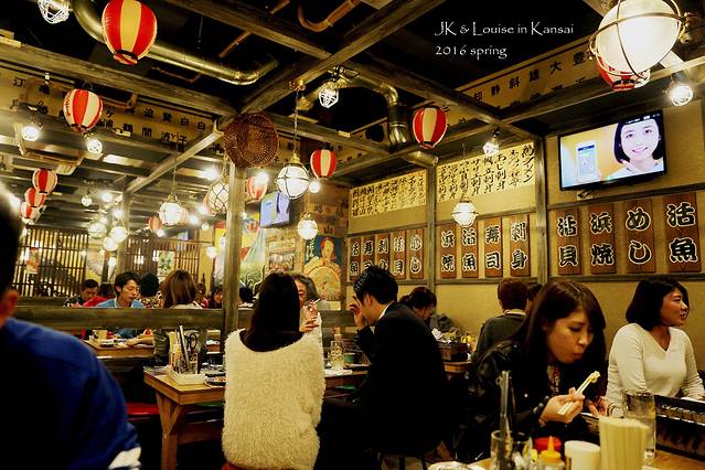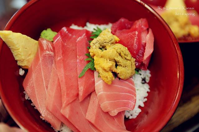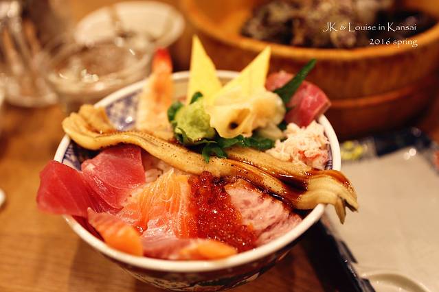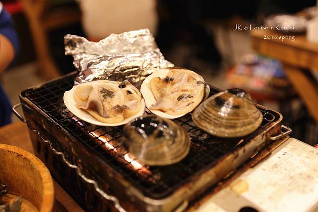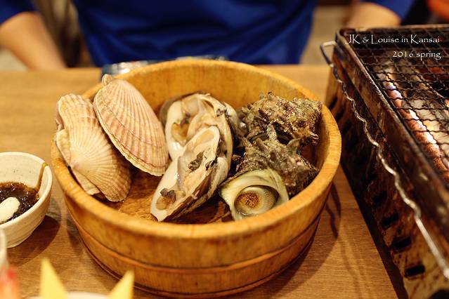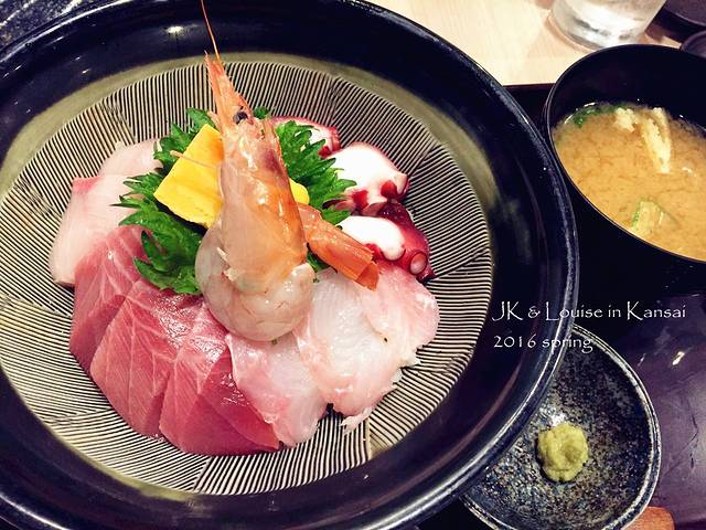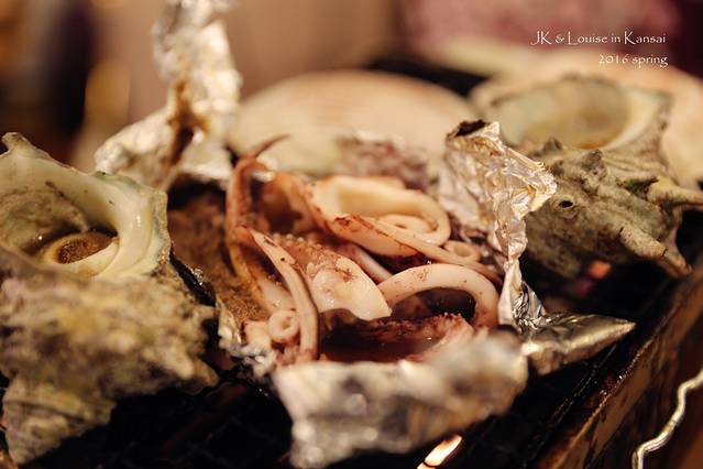 在心斋桥逛了一下午的我们早已是饥肠辘辘,晚上在道顿崛找到一家叫“丸矶水产”的海鲜店,店里面积不大很热闹。我们点了一份海鲜丼,分量很足很新鲜。然后再要了烤鱿鱼和一份贝类拼盘。元贝的肉真的又厚又超甜美!超赞!